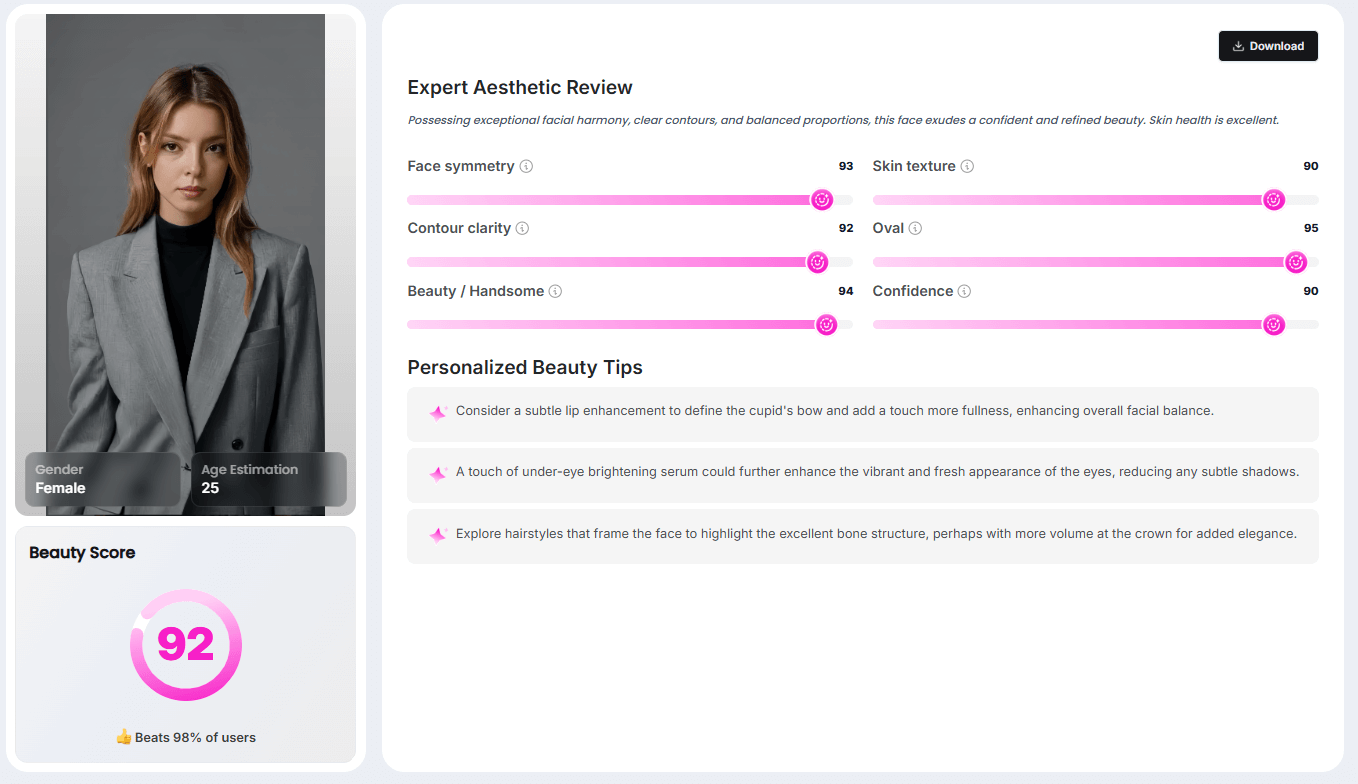 "In just 5 seconds, you'll receive a comprehensive beauty test report with ratings from multiple aspects, along with professional improvement suggestions. Download the report in PNG format and share it now."